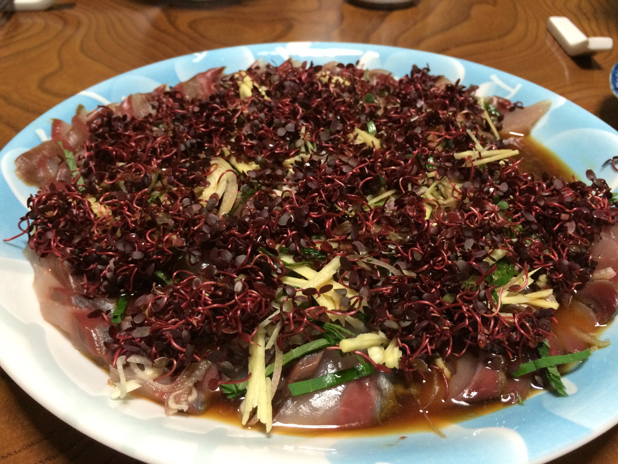 その上に、シソと生姜の千切りを散らして