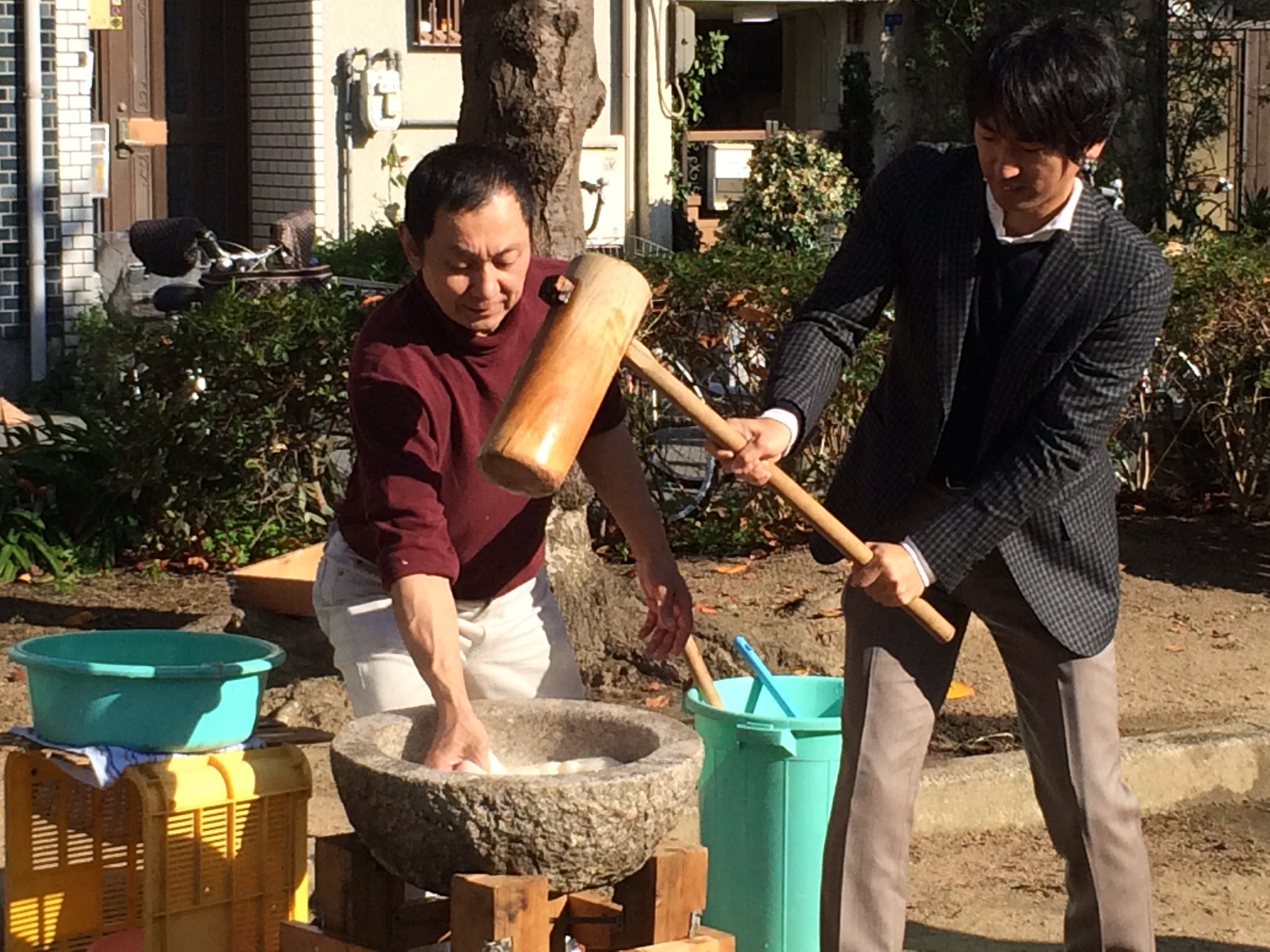 老いも若きも男性はお餅を搗く